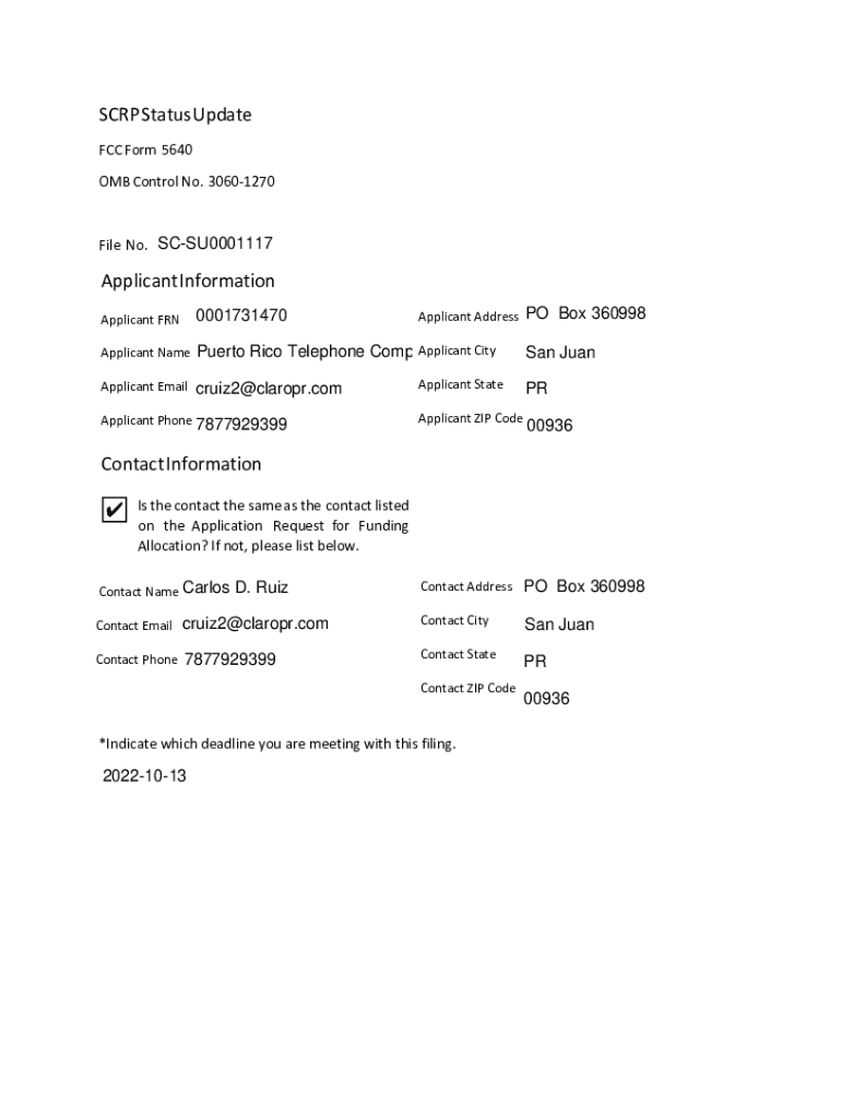 SCRAP Status Update FCC Form 5640 OMB Control No. 30601270File No. SCSU0001117Applicant Information Applicant AddressApplicant FRN0001731470Applicant NameApplicant Puerto Rico Telephone Company, Inc.