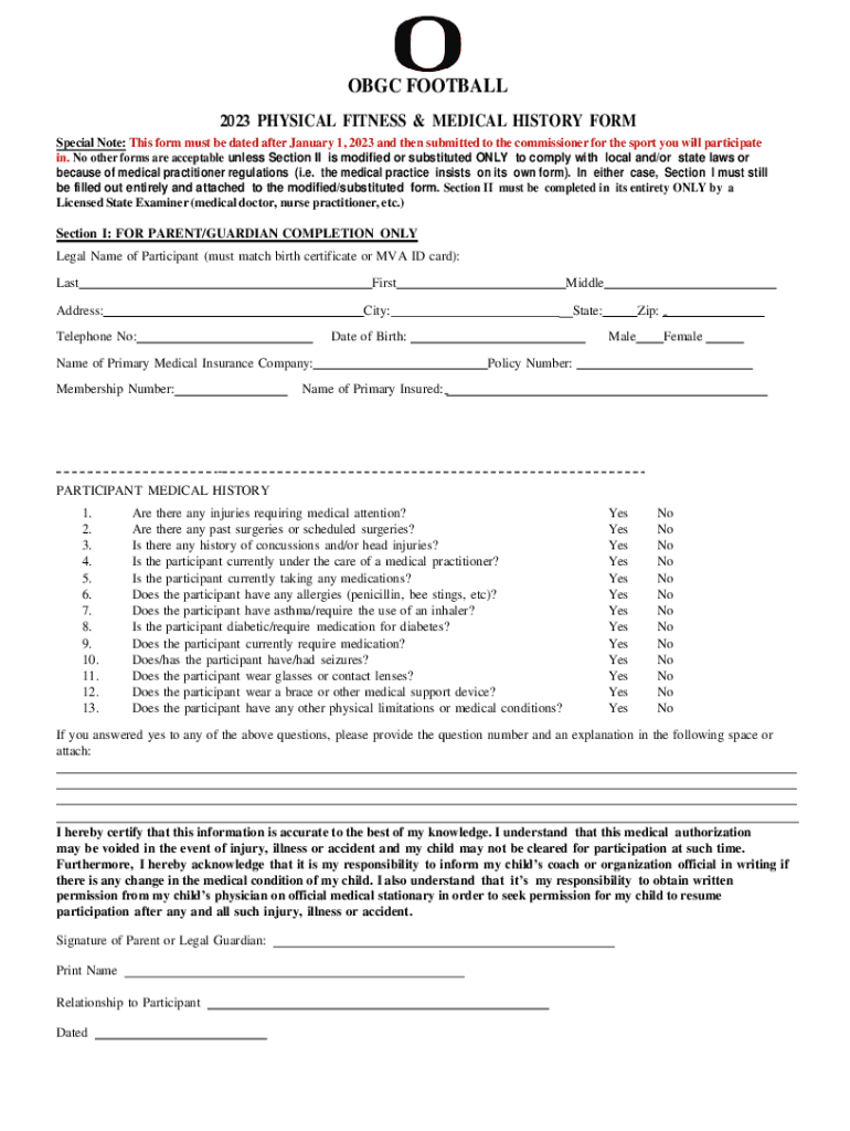 BGC FOOTBALL 2023 PHYSICAL FITNESS & MEDICAL HISTORY FORM Special Note: This form must be dated after January 1, 2023, and then submitted to the commissioner for the sport you will participate in.