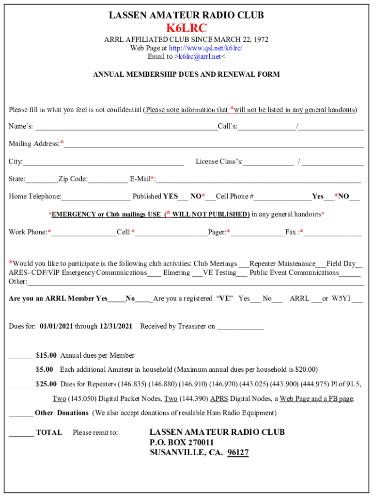 LASSEN AMATEUR RADIO CLUBK6LRC ARL AFFILIATED CLUB SINCE MARCH 22, 1972, Web Page at http://www.qsl.net/k6lrc/ Email to k6lrc@arrl.net ANNUAL MEMBERSHIP DUES AND RENEWAL Formulas fill in what you