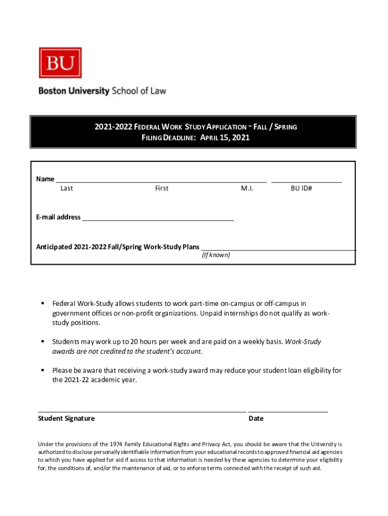 20212022 FEDERAL WORK STUDY APPLICATION FALL / SPRING FILING DEADLINE: APRIL 15, 2021Name ___ ___ Last First M.I. BU ID#Email address ___Anticipated 20212022 Fall/Spring Worsted Plans ___ (If known)Federal
