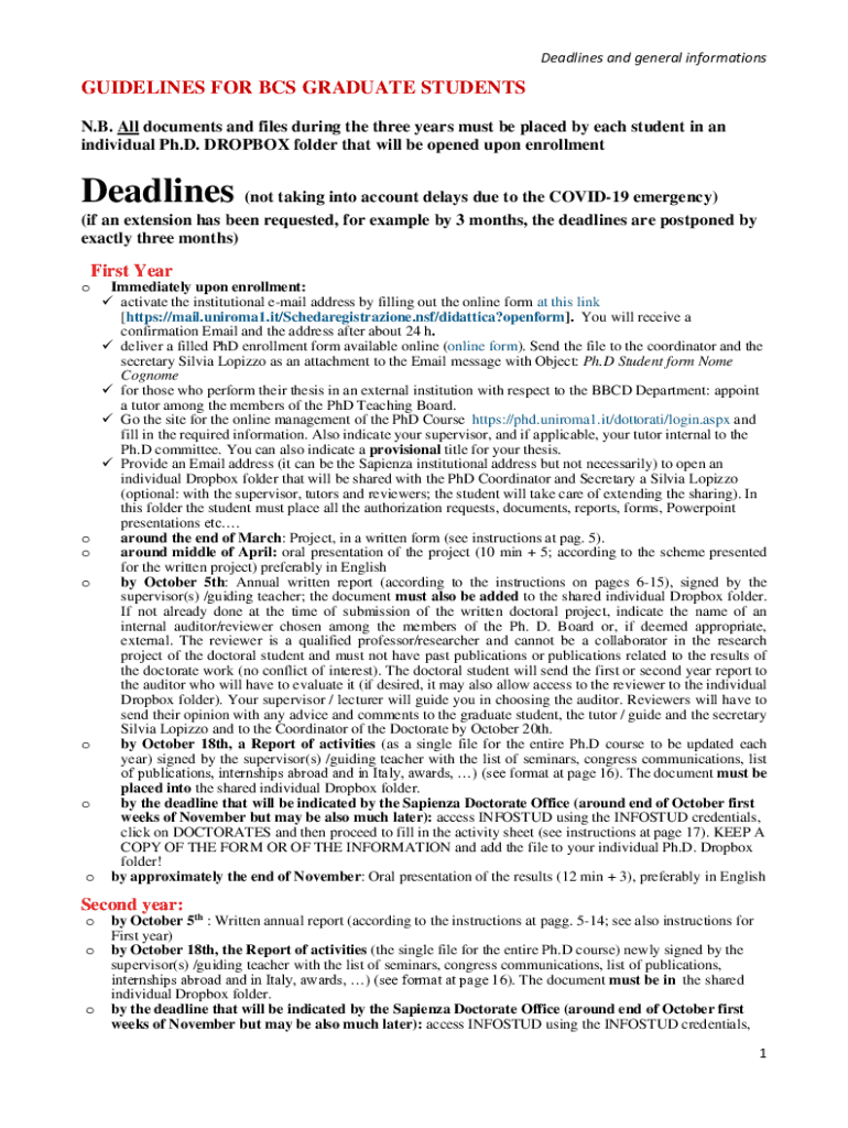 Deadlines and general informationsGUIDELINES FOR BCS GRADUATE STUDENTS N.B. All documents and files during the three years must be placed by each student in an individual Ph.D. DROPBOX folder that