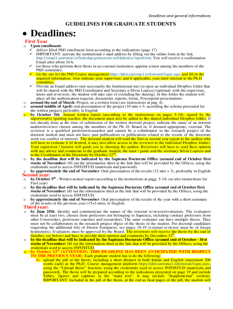 Deadlines and general informationsGUIDELINES FOR GRADUATE STUDENTS Deadlines: First Year OO o OO upon enrollment: deliver filled PhD enrollment form according to the indications (page 17) IMPORTANT: