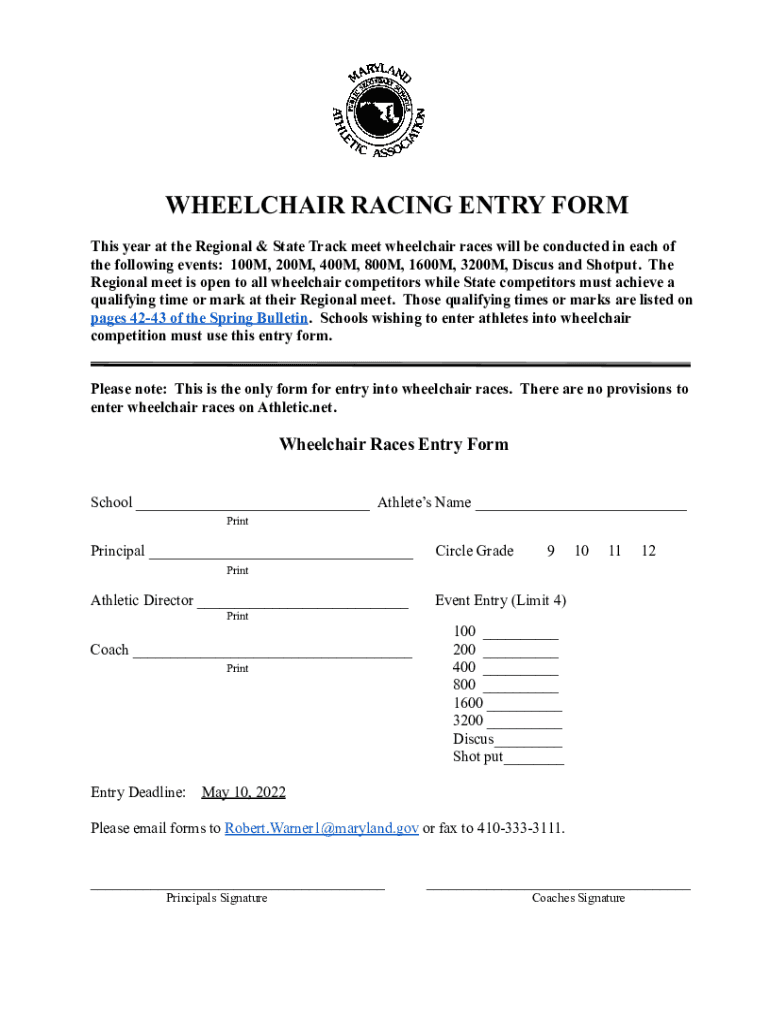 WHEELCHAIR RACING ENTRY From This year at the Regional & State Track meet wheelchair races will be conducted in each of the following events: 100M, 200M, 400M, 800M, 1600M, 3200M, Discus and Shot