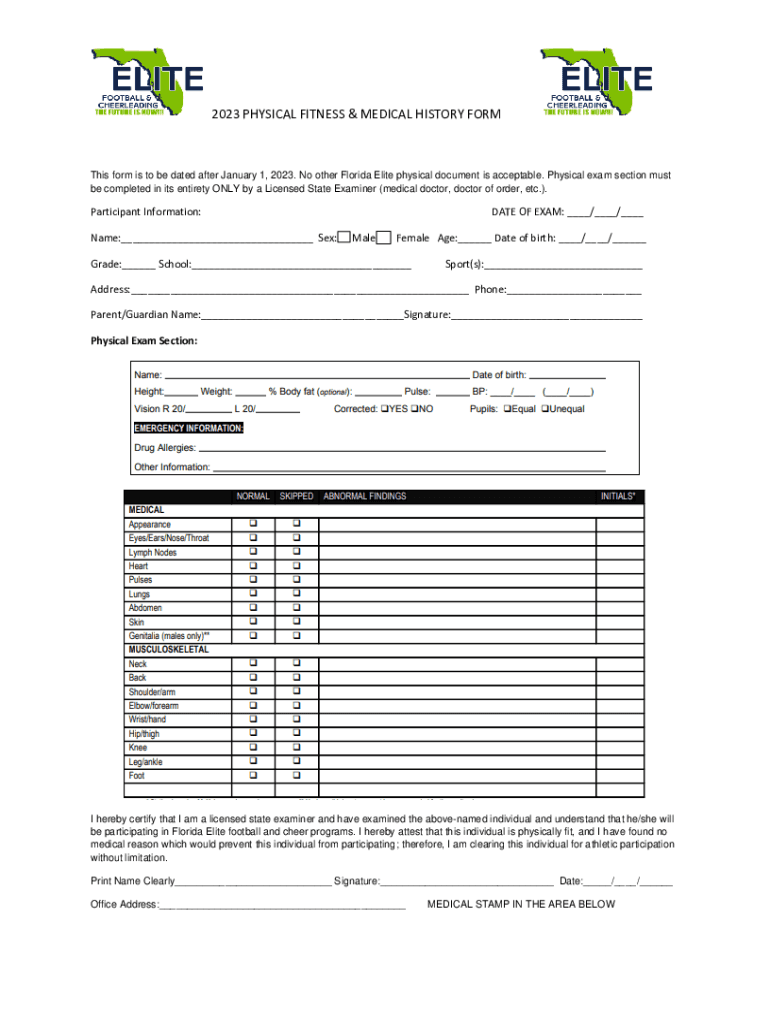 2023 PHYSICAL FITNESS & MEDICAL HISTORY Forms form is to be dated after January 1, 2023. No other Florida Elite physical document is acceptable. Physical exam section must be completed in its entirety