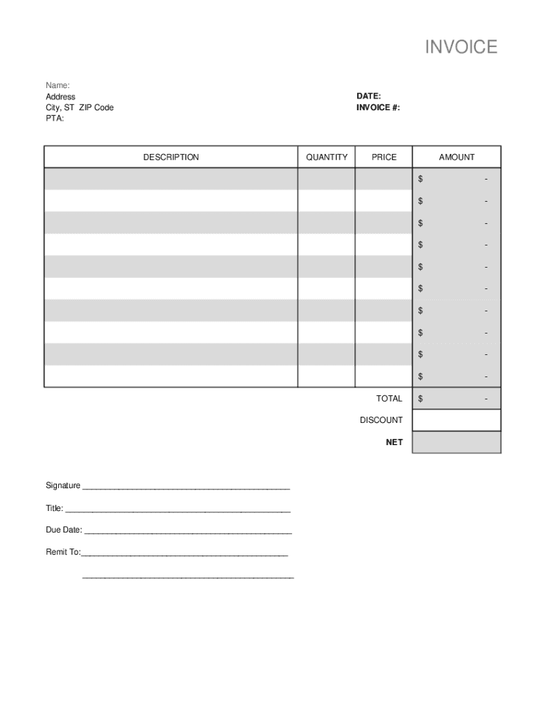 INVOICE Name: Address City, ST ZIP Code PTA:DATE: INVOICE #:DESCRIPTIONQUANTITYPRICETOTAL DISCOUNT E-signature ___ Title: ___ Due Date: ___ Remit To:___ ___AMOUNT $$$$$$$$$$$