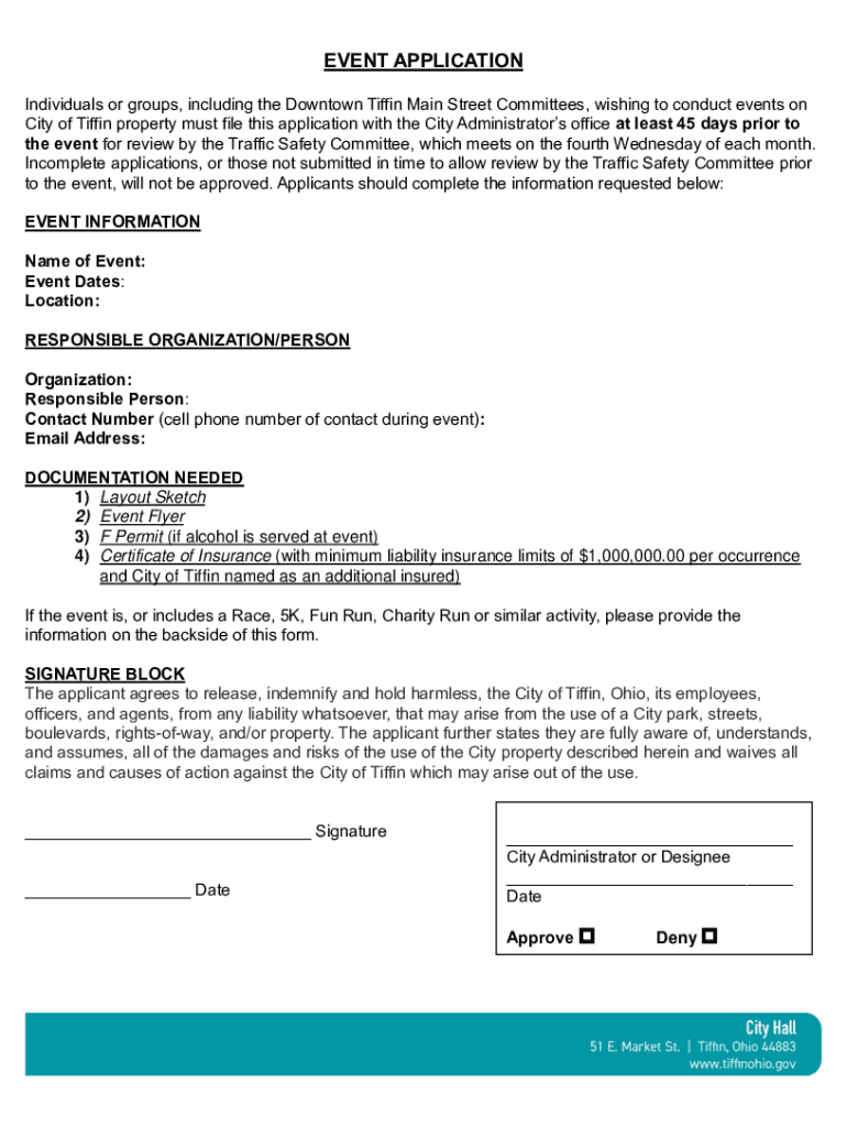 City Information Sheet On Obtaining a Permit to Conduct Events on City Property Individuals or groups, including the Downtown Tiffing Main Street Committees, wishing to conduct events (except parades)