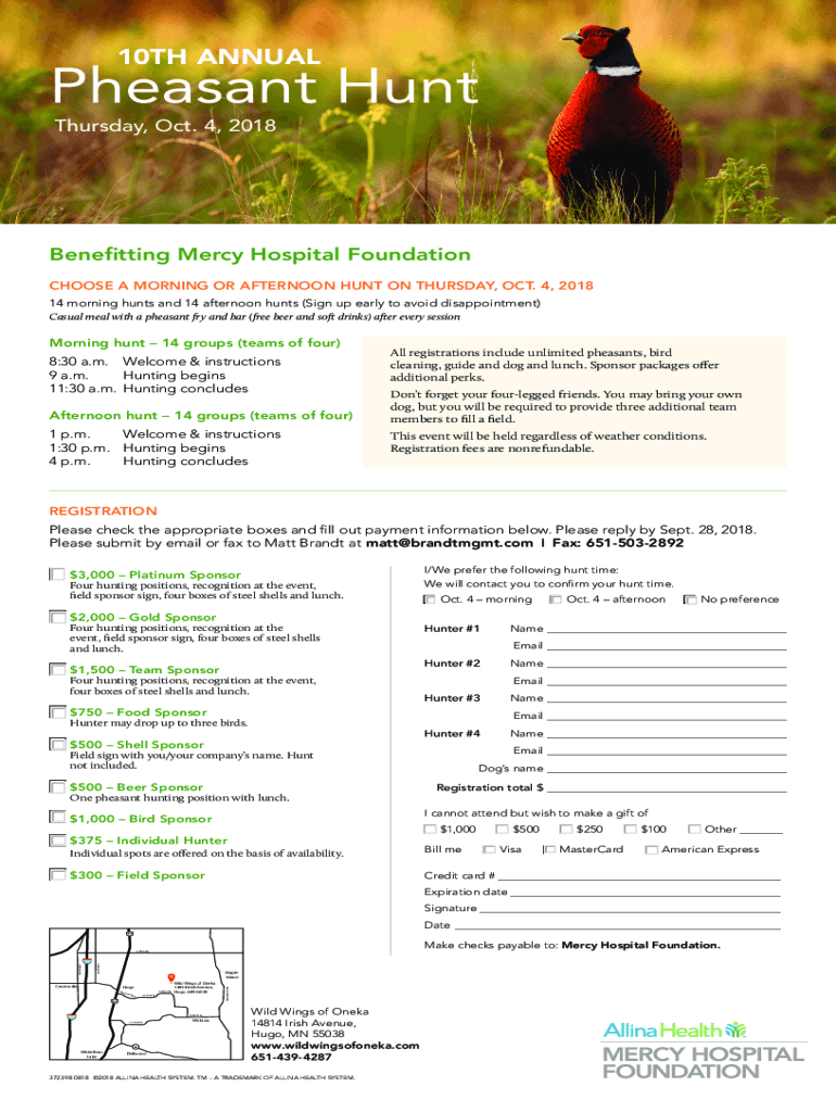 10TH ANNUALPheasant Hunt Thursday, Oct. 4, 2018Benefitting Mercy Hospital Foundation CHOOSE A MORNING OR AFTERNOON HUNT ON THURSDAY, OCT. 4, 2018 14 morning hunts and 14 afternoon hunts (Sign up early