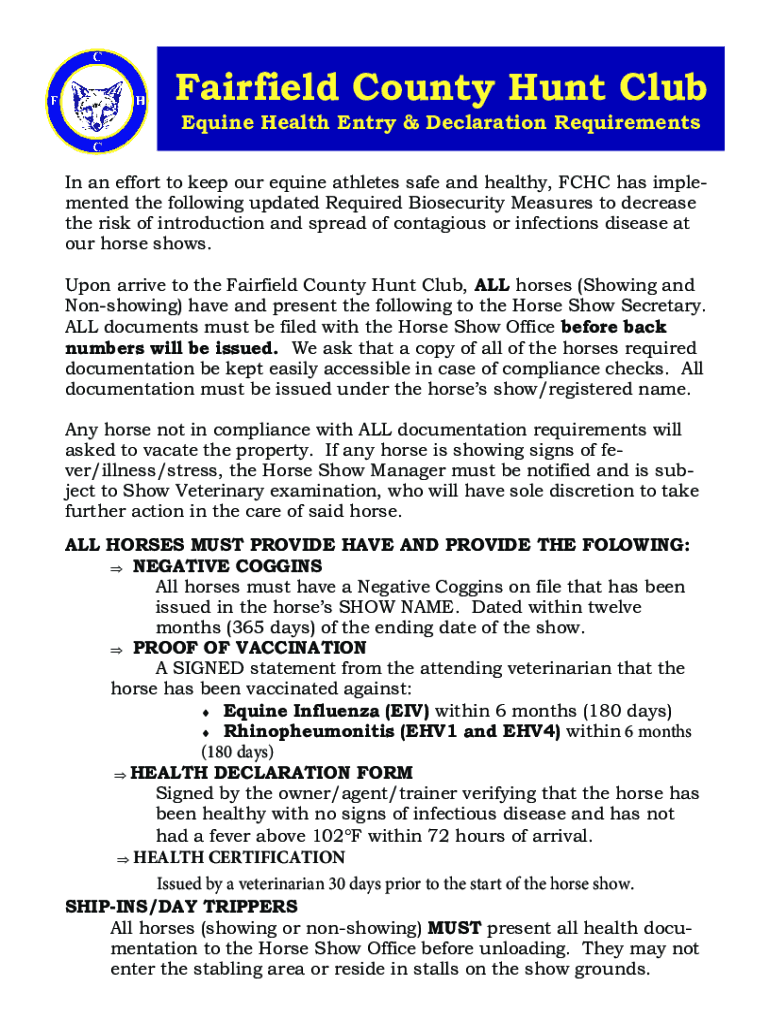 Fairfield County Hunt Club Equine Health Entry & Declaration Requirements In an effort to keep our equine athletes safe and healthy, FCC has implemented the following updated Required Biosecurity