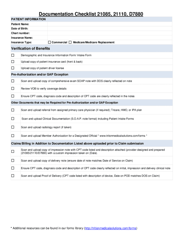 Documentation Checklist 21085, 21110, D7880 PATIENT INFORMATION Patient Name: Date of Birth: Chart number: Insurance Name: Insurance Type:Commercial Medicare/Medicare ReplacementVerification of Benefits