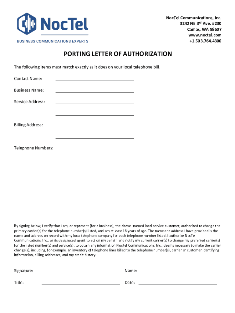 Noted Communications, Inc. 3242 NE 3rd Ave. #230 Camps, WA 98607 www.noctel.com +1.503.764.4300PORTING LETTER OF AUTHORIZATION The following items must match exactly as it does on your local telephone
