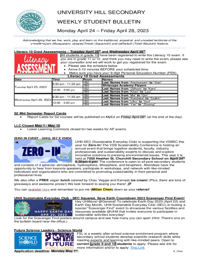 UNIVERSITY HILL SECONDARY WEEKLY STUDENT BULLETIN Monday, April 24 Friday, April 28, 2023, Acknowledging that we live, work, play and learn on the traditional, ancestral, and needed territories of