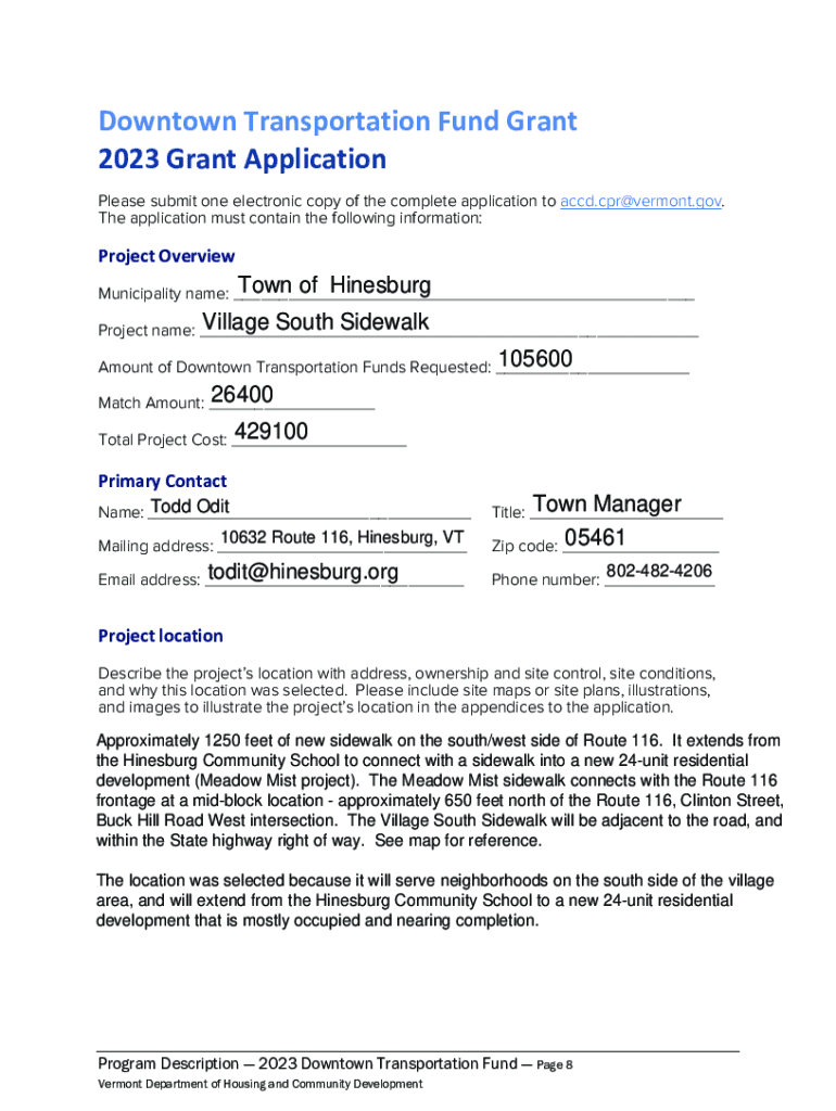 Downtown Transportation Fund Grant 2023 Grant Application Please submit one electronic copy of the complete application to accd.cpr@vermont.gov. The application must contain the following information:Project