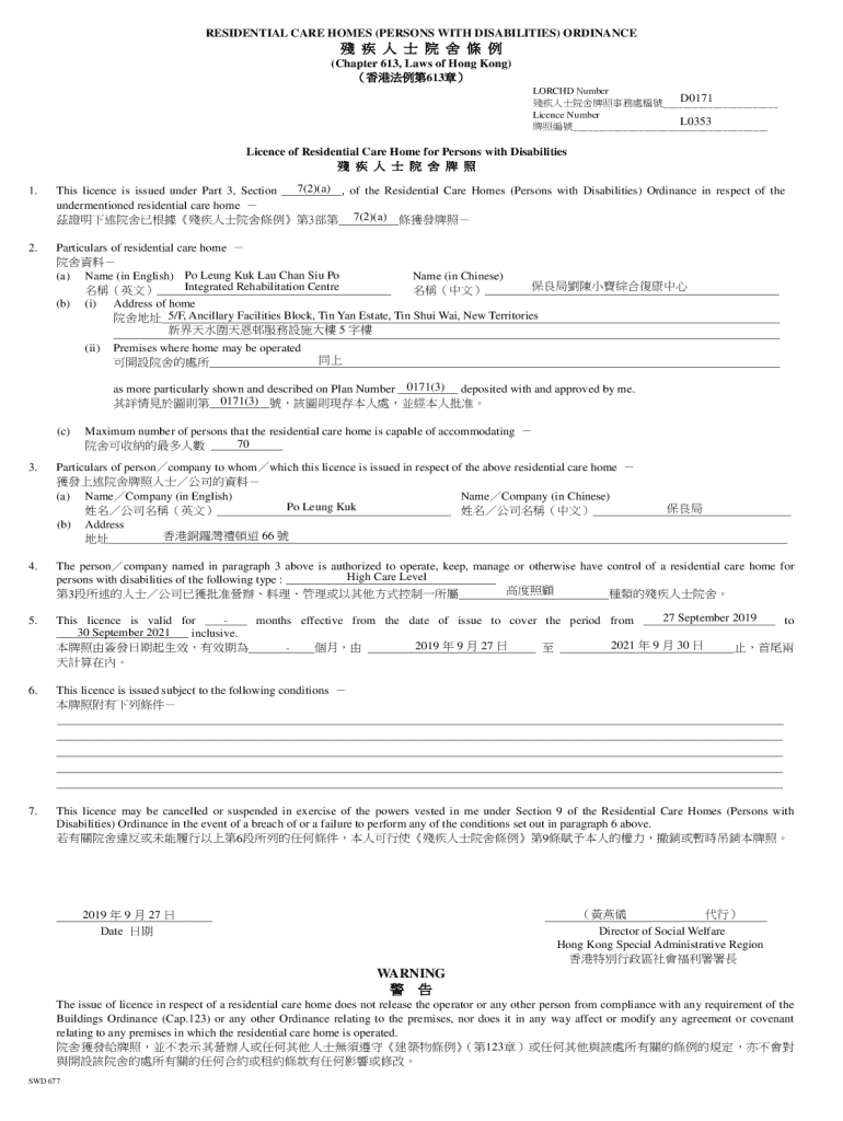 RESIDENTIAL CARE HOMES (PERSONS WITH DISABILITIES) ORDINANCE (Chapter 613, Laws of Hong Kong) 613 FORCED Number D0171 ___ License Number L0353 ___License of Residential Care Home for Persons with