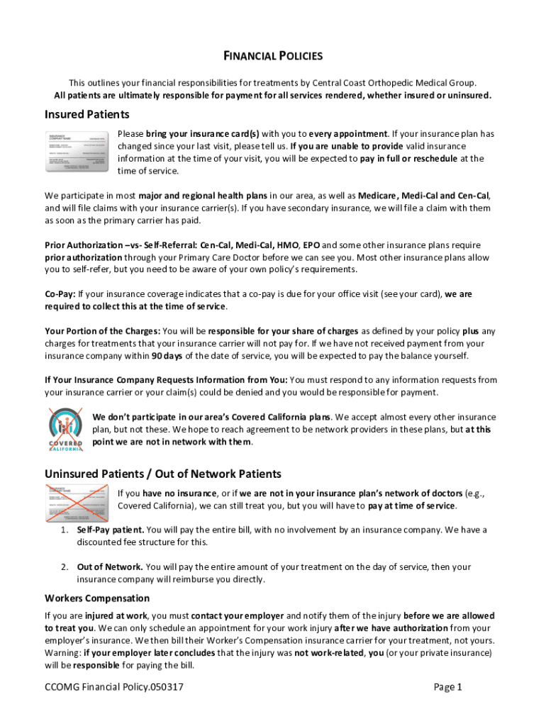 FINANCIAL POLICIESThis outlines your financial responsibilities for treatments by Central Coast Orthopedic Medical Group. All patients are ultimately responsible for payment for all services rendered,