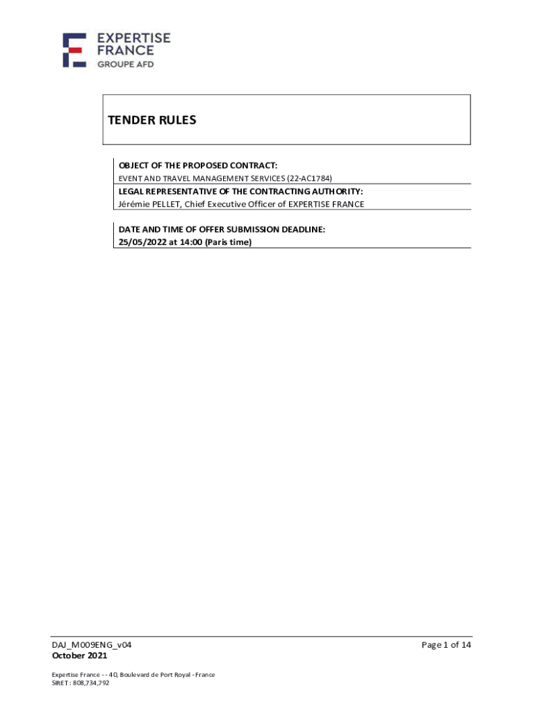 TENDER RULESOBJECT OF THE PROPOSED CONTRACT: EVENT AND TRAVEL MANAGEMENT SERVICES (22AC1784)LEGAL REPRESENTATIVE OF THE CONTRACTING AUTHORITY: Jamie PELLET, Chief Executive Officer of EXPERTISE FRANCE