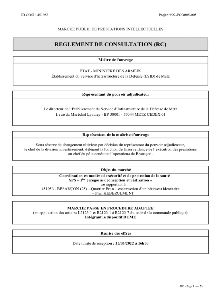 ID COSI : 451953Projet n22PCO005005MARCHE PUBLIC DE PRESTATIONS INTELLECTUELLESREGLEMENT DE CONSULTATION (RC)