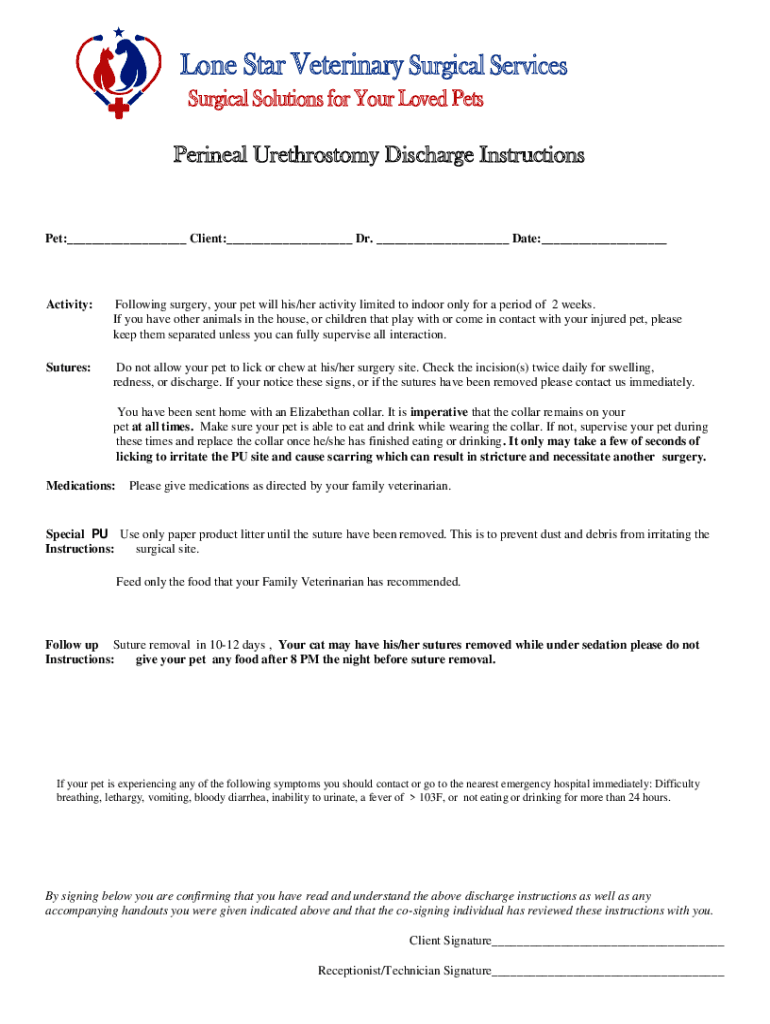 Lone Star Veterinary Surgical Services Surgical Solutions for Your Loved Pets Perineal Ureterotomy Discharge Instructions:___ Client:___ Dr. ___ Date:___Activity:Following surgery, your pet will his/her