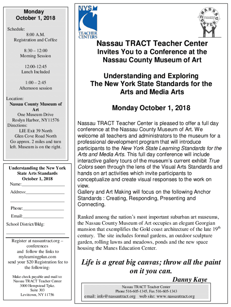 Monday, October 1, 2018, Schedule: 8:00 A.M. Registration and Coffee 8:30 12:00 Morning Session 12:0012:45 Lunch Included 1:00 2:45 Afternoon session Location: Nassau County Museum of Art One Museum