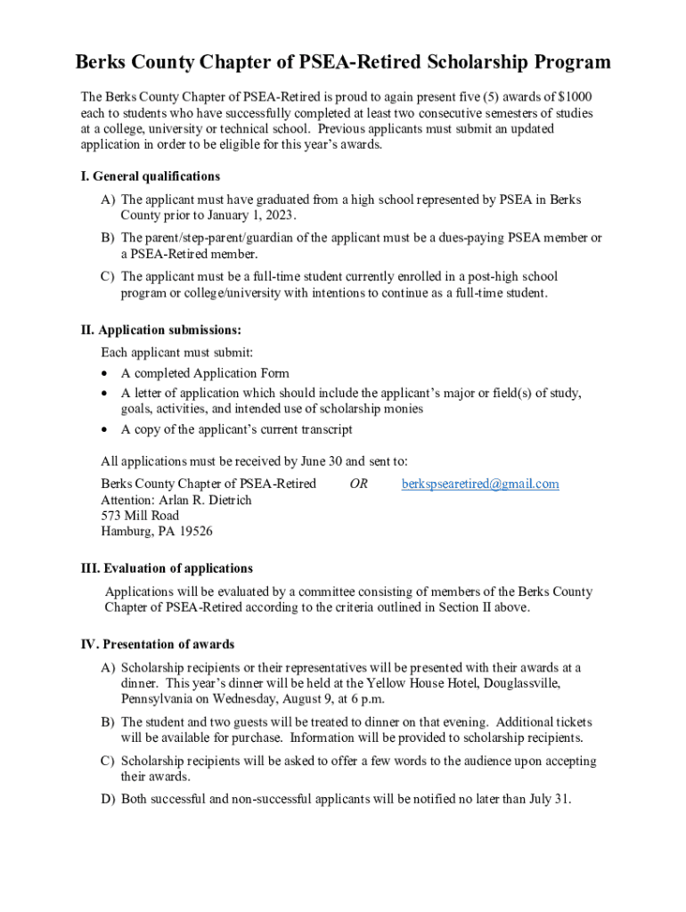 The Berks County Chapter of Semiretired is proud to again present five (5) awards of $1000