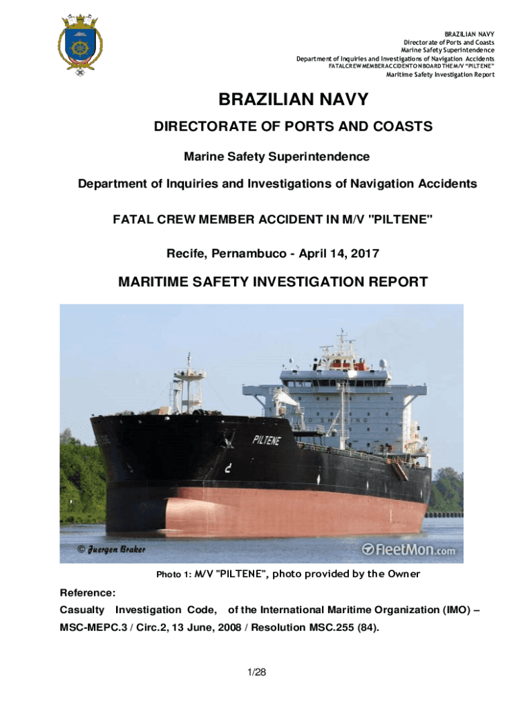 BRAZILIAN NAVY Directorate of Ports and Coasts Marine Safety Superintendence Department of Inquiries and Investigations of Navigation Accidents FATAL CREW MEMBER ACCIDENT ON BOARD THE M/V PILTENEMaritime