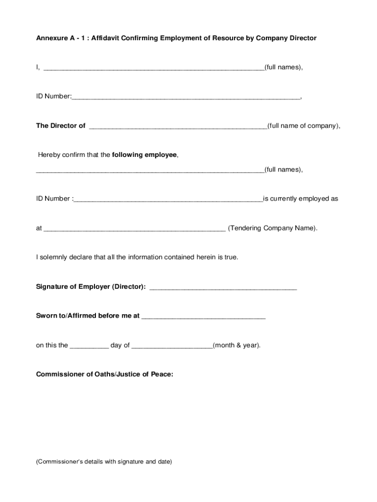 Appendix A 1 : Affidavit Confirming Employment of Resource by Company Director, ___(full names), ID Number:___, The Director of ___(full name of company), Hereby confirm that the following employee,