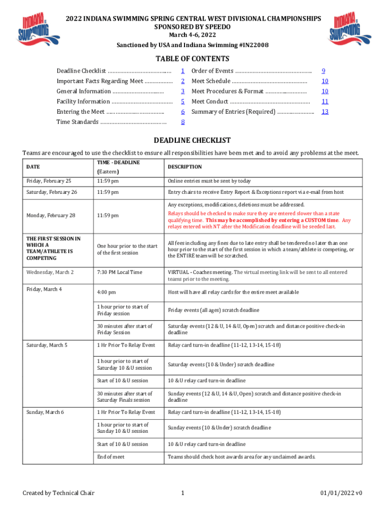 2022 INDIANA SWIMMING SPRING CENTRAL WEST DIVISIONAL CHAMPIONSHIPS SPONSORED BY SPEED March 46, 2022 Sanctioned by the USA and Indiana Swimming #IN22008TABLE OF CONTENTS Deadline Checklist .1Order