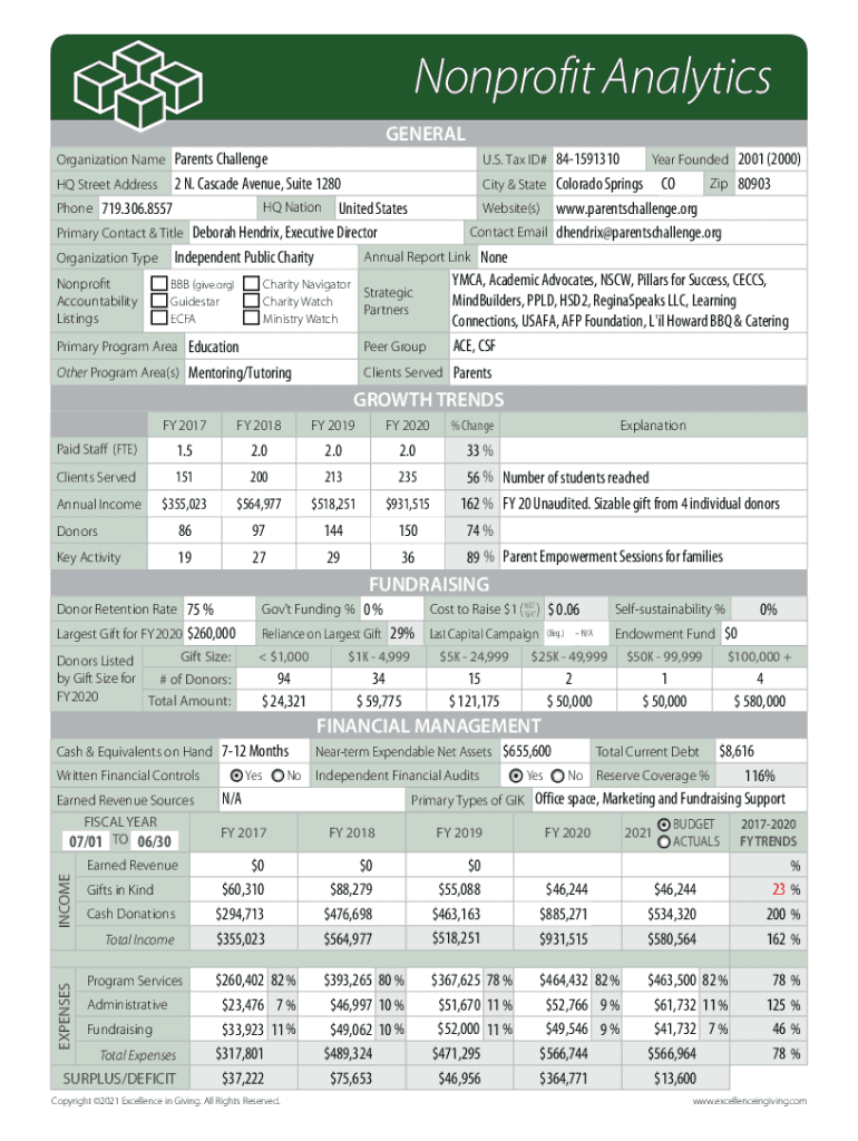 Nonprofit Analytics GENERAL U.S. Tax ID# 841591310 Year Founded 2001 (2000) Parents Challenge Zip 80903 HQ Street Address 2 N. Cascade Avenue, Suite 1280 City & State Colorado Springs CO HQ Nation