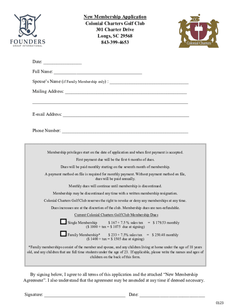 New Membership Application Colonial Charters Golf Club 301 Charter Drive Longs, SC 29568 8433994653Date: ___ Full Name: ___ Spouses Name (if Family Membership only) : ___ Mailing Address: ___ ___