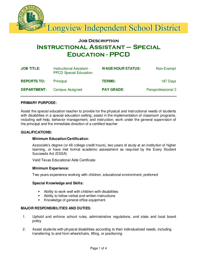 Get the free Special Education Instructional Assistant Job Description - w3 lisd