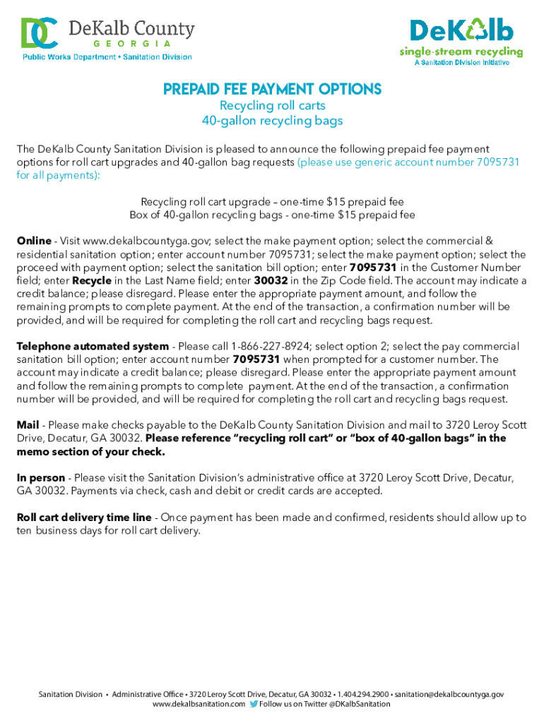 Prepaid Fee Payment Options Recycling roll carts 40gallon recycling bathe DeKalb County Sanitation Division is pleased to announce the following prepaid fee payment options for roll cart upgrades