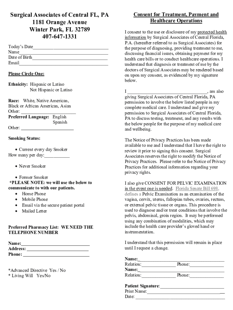 Surgical Associates of Central FL, PA 1181 Orange Avenue Winter Park, FL 32789 4076471331 Todays Date___ Name___ Date of Birth___ Email___ Please Circle One: Ethnicity: Hispanic or Latino Not Hispanic