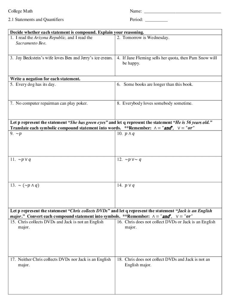 Get the free Solved College Math 2.1 Statements and Quantifiers Name
