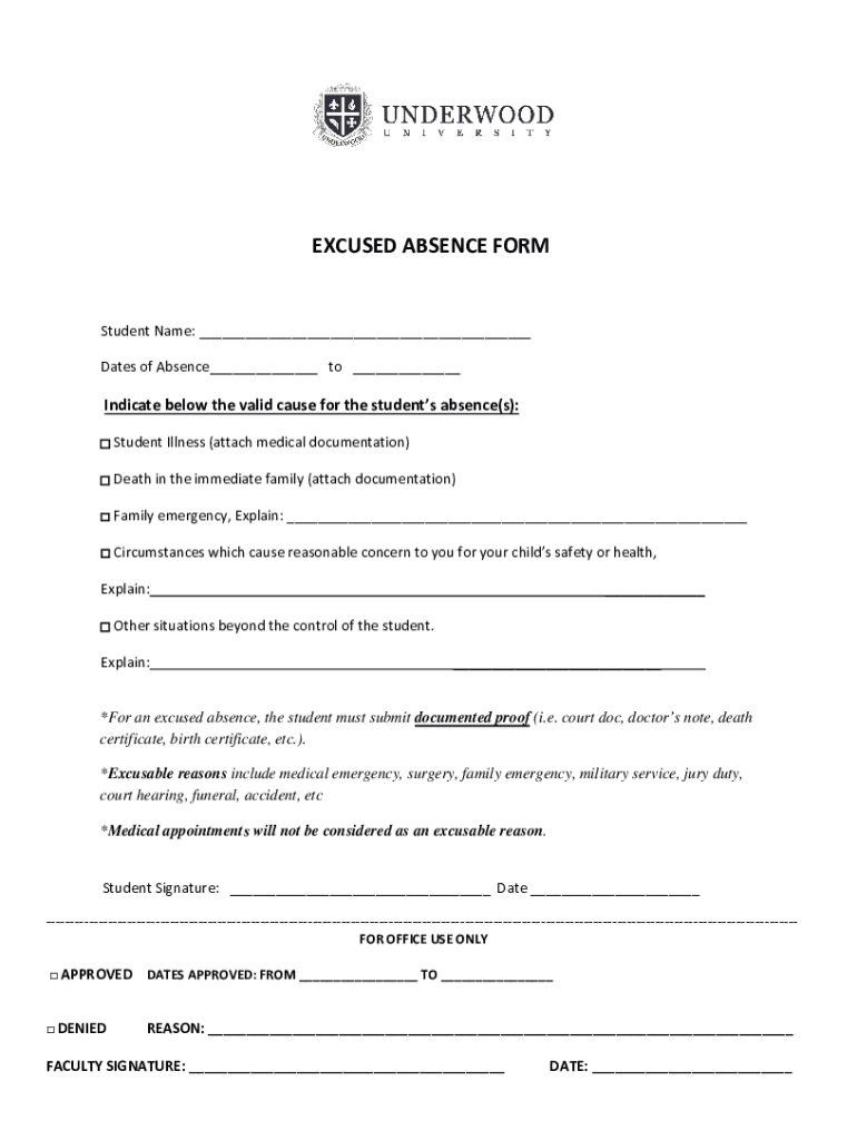 EXCUSED ABSENCE FORMStudent Name: ___ Dates of Absence___ to ___Indicate below the valid cause for the students' absence(s): Student Illness (attach medical documentation) Death in the immediate family