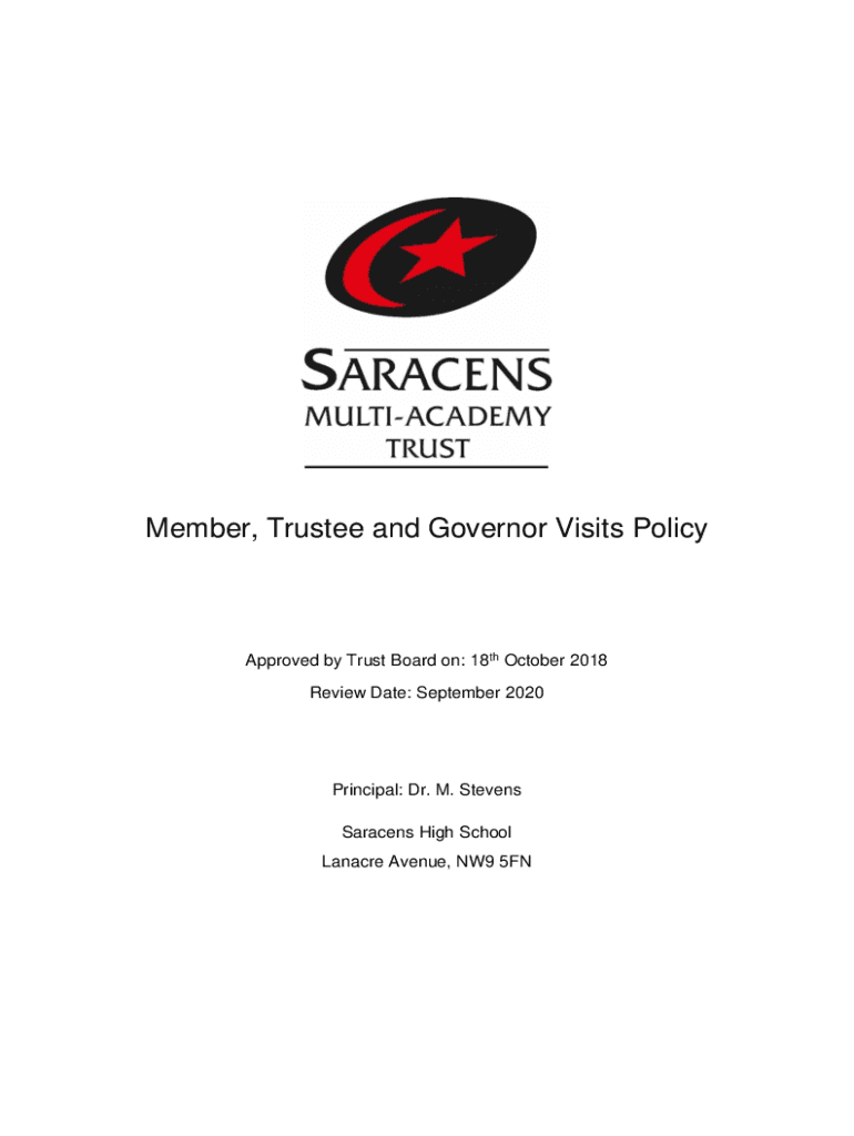 Member, Trustee and Governor Visits PolicyApproved by Trust Board on: 18th October 2018 Review Date: September 2020Principal: Dr. M. Stevens Saracens High School La nacre Avenue, NW9 5FNContents 1.
