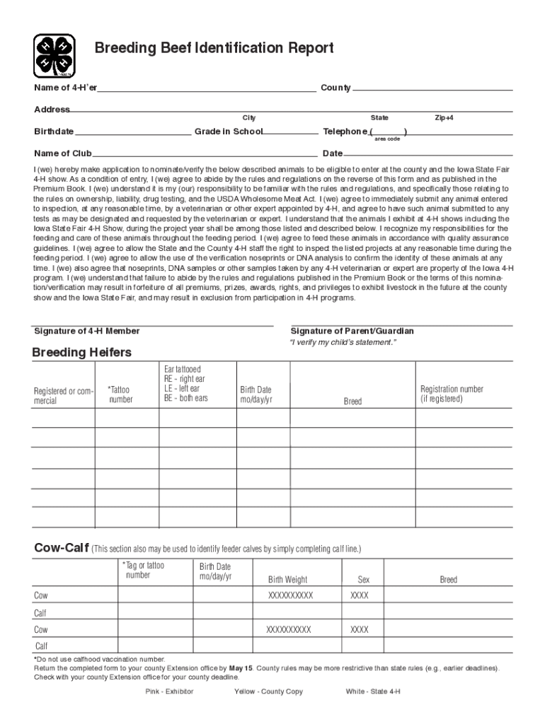 Breeding Beef Identification Report Name of 4HerCountyAddressCityBirthdateStateGrade in SchoolTelephone (Name of Club area CODEVI+4)Date (we) hereby make application to nominate/verify the below described