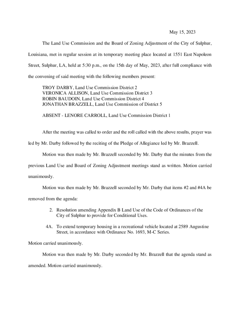 May 15, 2023, The Land Use Commission and the Board of Zoning Adjustment of the City of Sulfur, Louisiana, met in regular session at its temporary meeting place located at 1551 East Napoleon Street,
