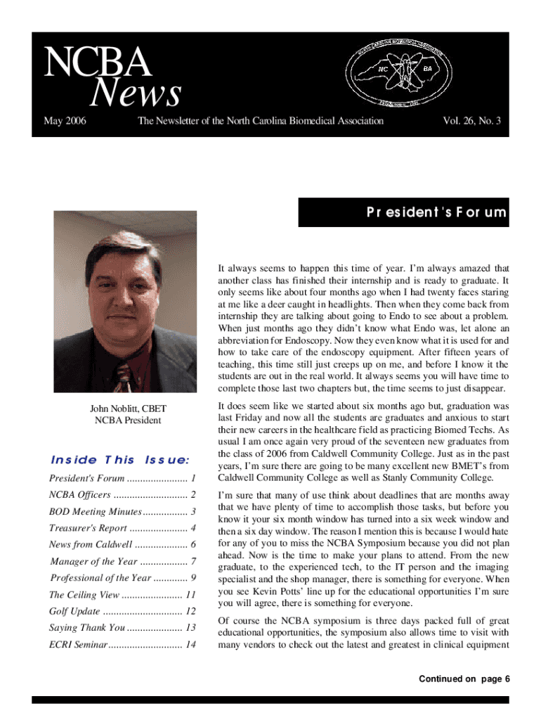 NCAA News May 2006The Newsletter of the North Carolina Biomedical Association. 26, No. 3President\'s Forum It always seems to happen this time of year. I'm always amazed that another class has finished