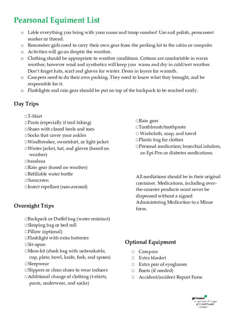Personal Equipment List o Label everything you bring with your name and troop number! Use nail polish, permanent marker or thread. O Remember girls need to carry their own gear from the parking lot