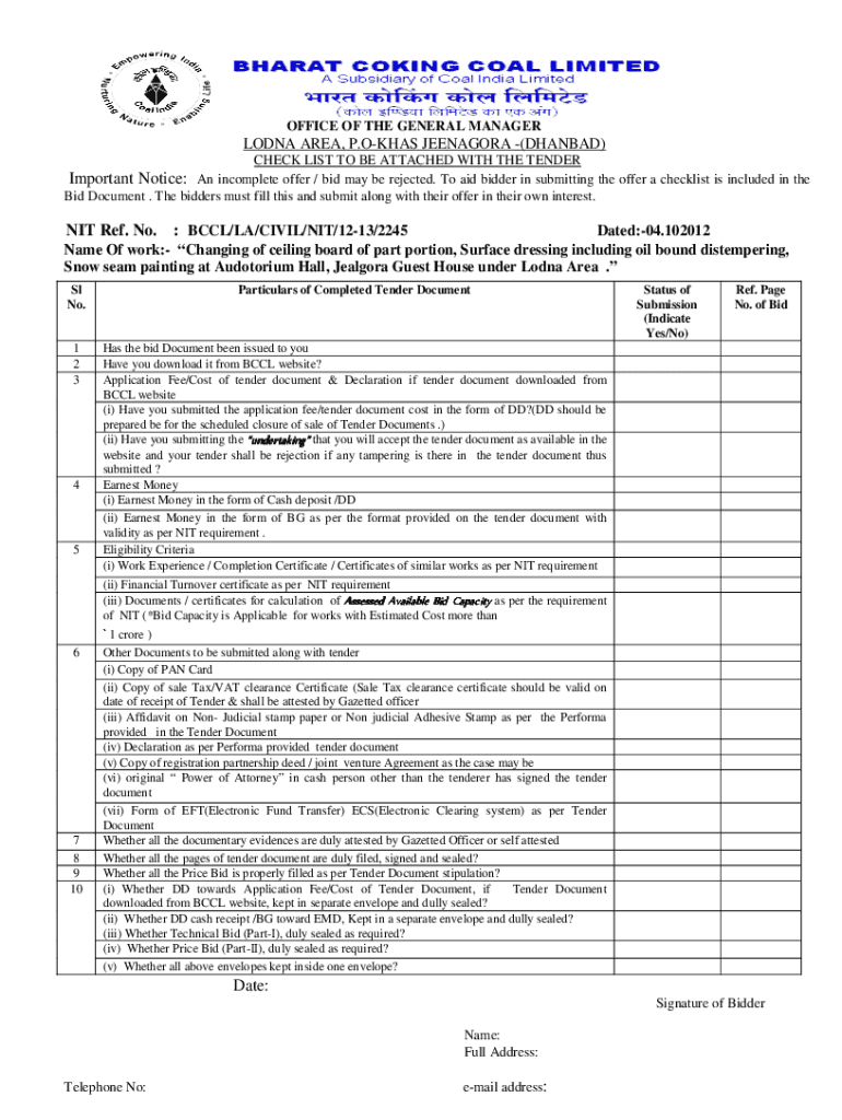 OFFICE OF THE GENERAL MANAGERLODNA AREA, P.OKRAS TEENAGER (DHANBAD) CHECK LIST TO BE ATTACHED WITH THE TENDERImportant Notice: An incomplete offer / bid may be rejected. To aid bidder in submitting
