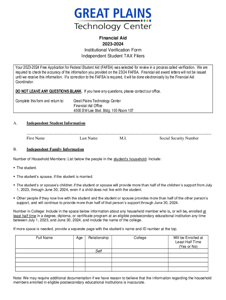 Financial Aid 20232024 Institutional Verification Form Independent Student TAX Filers Your 20232024 Free Application for Federal Student Aid (FAFSA) was selected for review in a process called verification.