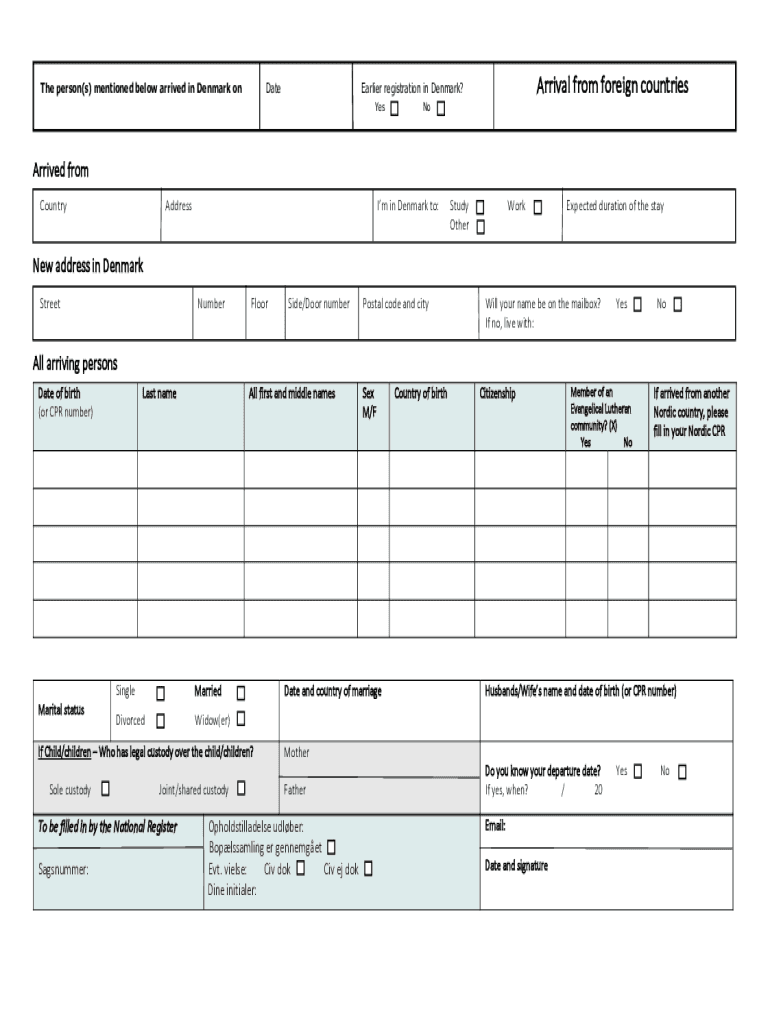 The person(s) mentioned below arrived in Denmark onDateArrival from foreign countriesEarlier registration in Denmark?