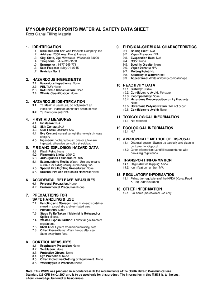 MINOR PAPER POINTS MATERIAL SAFETY DATA SHEET Root Canal Filling Material 1. IDENTIFICATION 1.1. 1.2. 1.3. 1.4. 1.5. 1.6. 1.7. Manufactured For: Ada Products Company, Inc. Address: 2350 West Florist