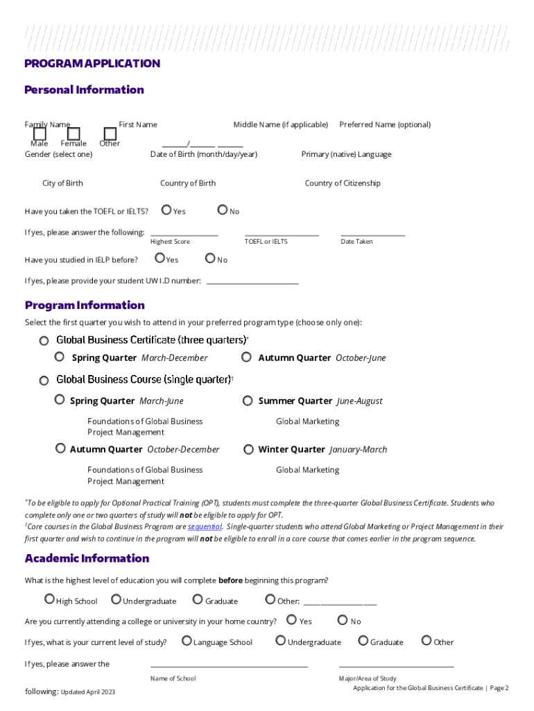 W_CO_N_T_I_N_UU_M_C_O_LL_E_G_E University of Washington International & English LanguageProgramsCERTIFICATE PROGRAM APPLICATION FORMGLOBALBUSINESSCERTIFICATE APPLICATION REQUIREMENTS To apply to the
