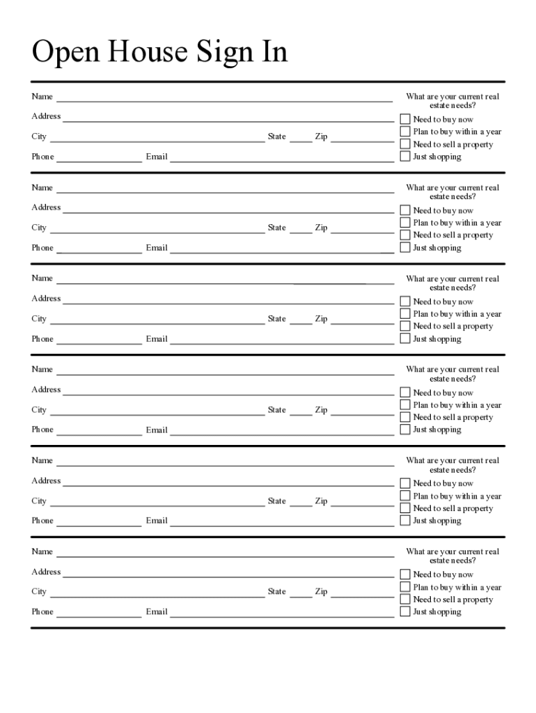 Open House Sign In Somewhat are your current real estate needs? Address City PhoneStateZipEmailNameWhat are your current real estate needs? Address City PhoneStateZipEmailNameCityStateZipEmailNameCityStateZipEmailNameCityStateZipEmailNameNeed