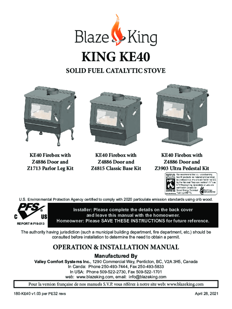 KING KE40SOLID FUEL CATALYTIC STOVEKE40 Firebox with Z4886 Door and Z1713 Parlor Leg KitKE40 Firebox with Z4886 Door and Z4815 Classic Base KitKE40 Firebox with Z4886 Door and Z3903 Ultra Pedestal