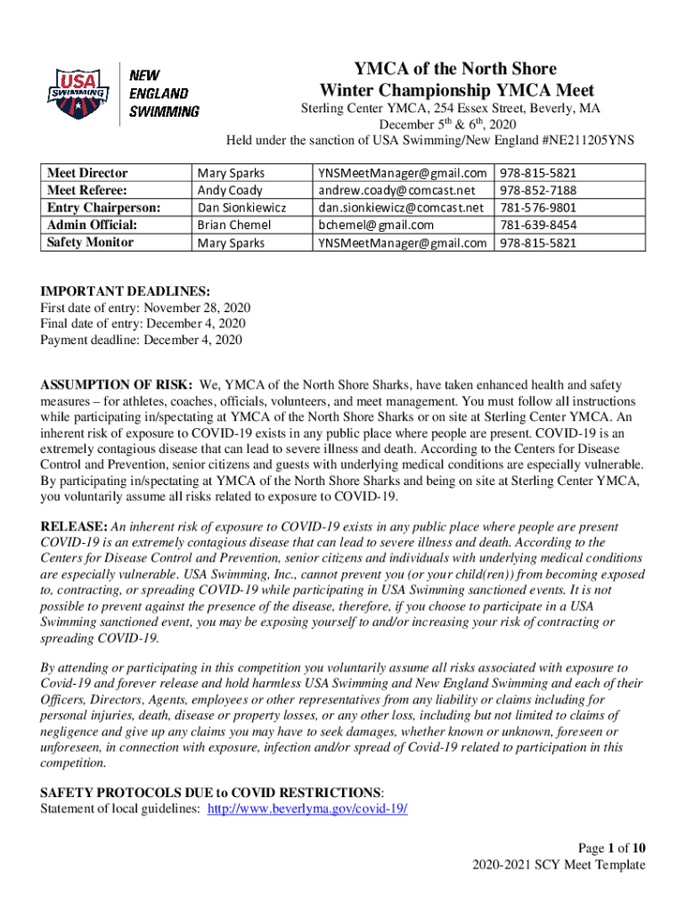 YMCA of the North Shore Winter Championship YMCA Meet Sterling Center YMCA, 254 Essex Street, Beverly, MA December 5th & 6th, 2020 Held under the sanction of USA Swimming/New England #NE211205YNS