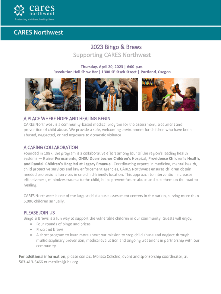 2023 Bingo & Brews Supporting CARES Northwest Thursday, April 20, 2023 | 6:00 p.m. Revolution Hall Show Bar | 1300 SE Stark Street | Portland, Oregon PLACE WHERE HOPE AND HEALING BEGIN CARES Northwest