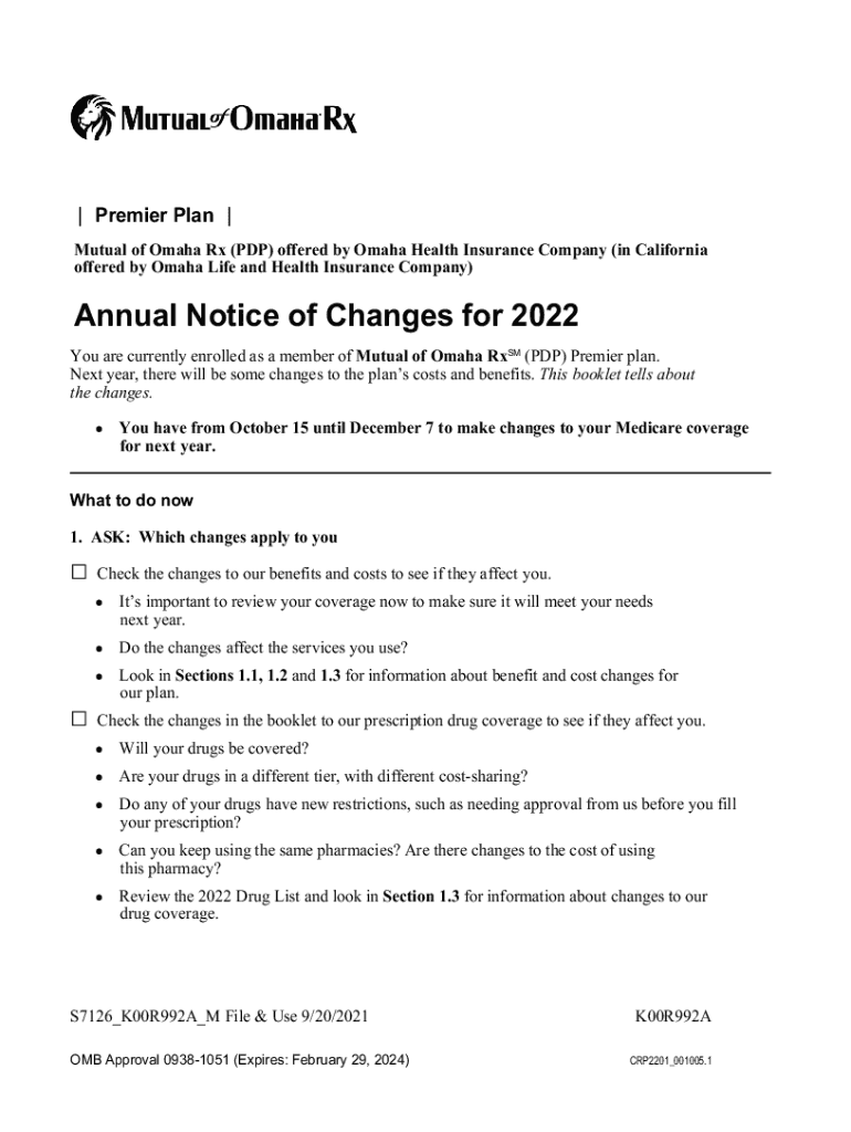 . Premier Plan Mutual of Omaha Rx (PDP) offered by Omaha Health Insurance Company (in California offered by Omaha Life and Health Insurance Company)Annual Notice of Changes for 2022 You are currently