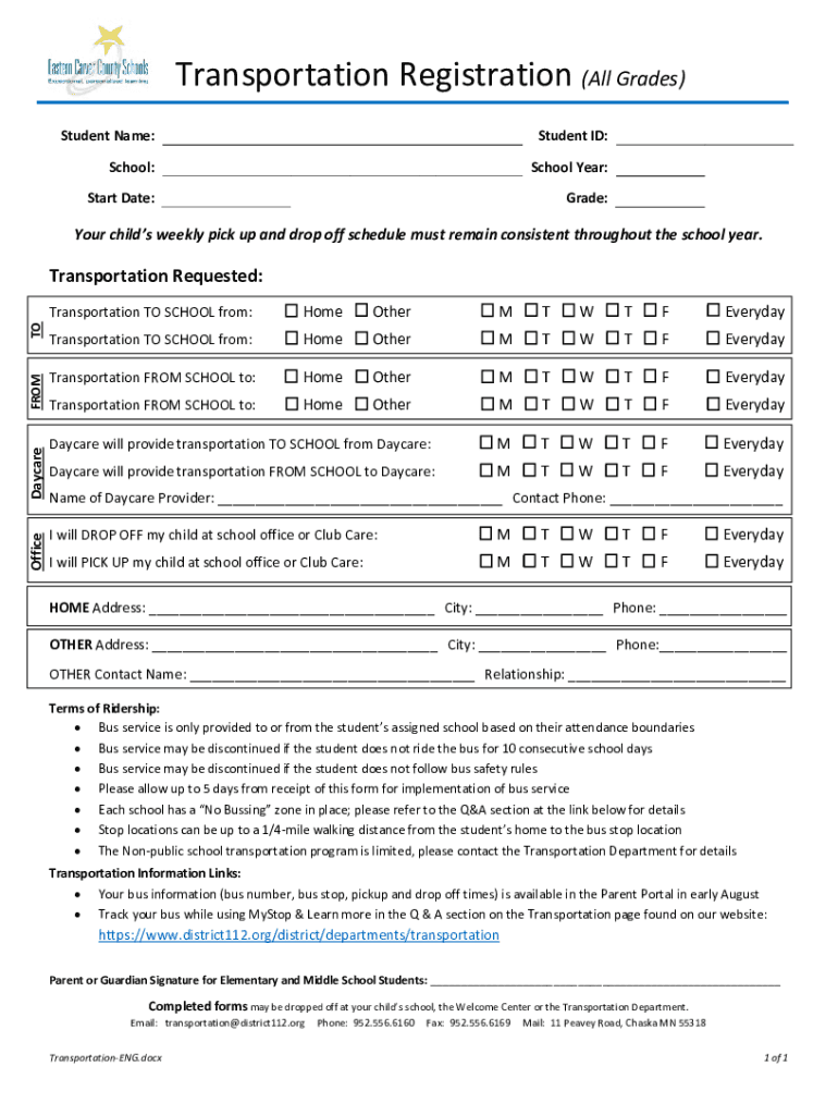 Transportation Registration (All Grades) Student Name:Student ID:School:School Year:Start Date:Grade:Your children weekly pick up and drop off schedule must remain consistent throughout the school