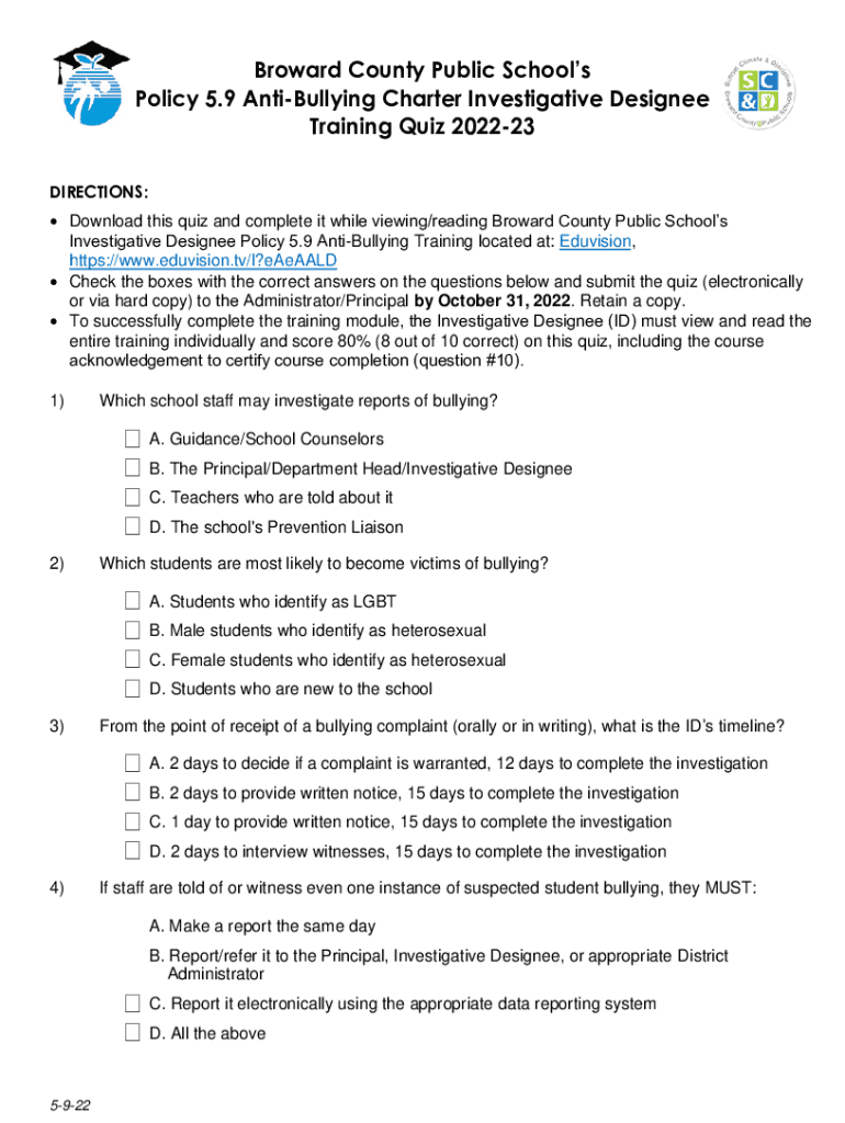 Broward County Public Schools Policy 5.9 AntiBullying Charter Investigative Designee Training Quiz 202223 DIRECTIONS: Download this quiz and complete it while viewing/reading Broward County Public